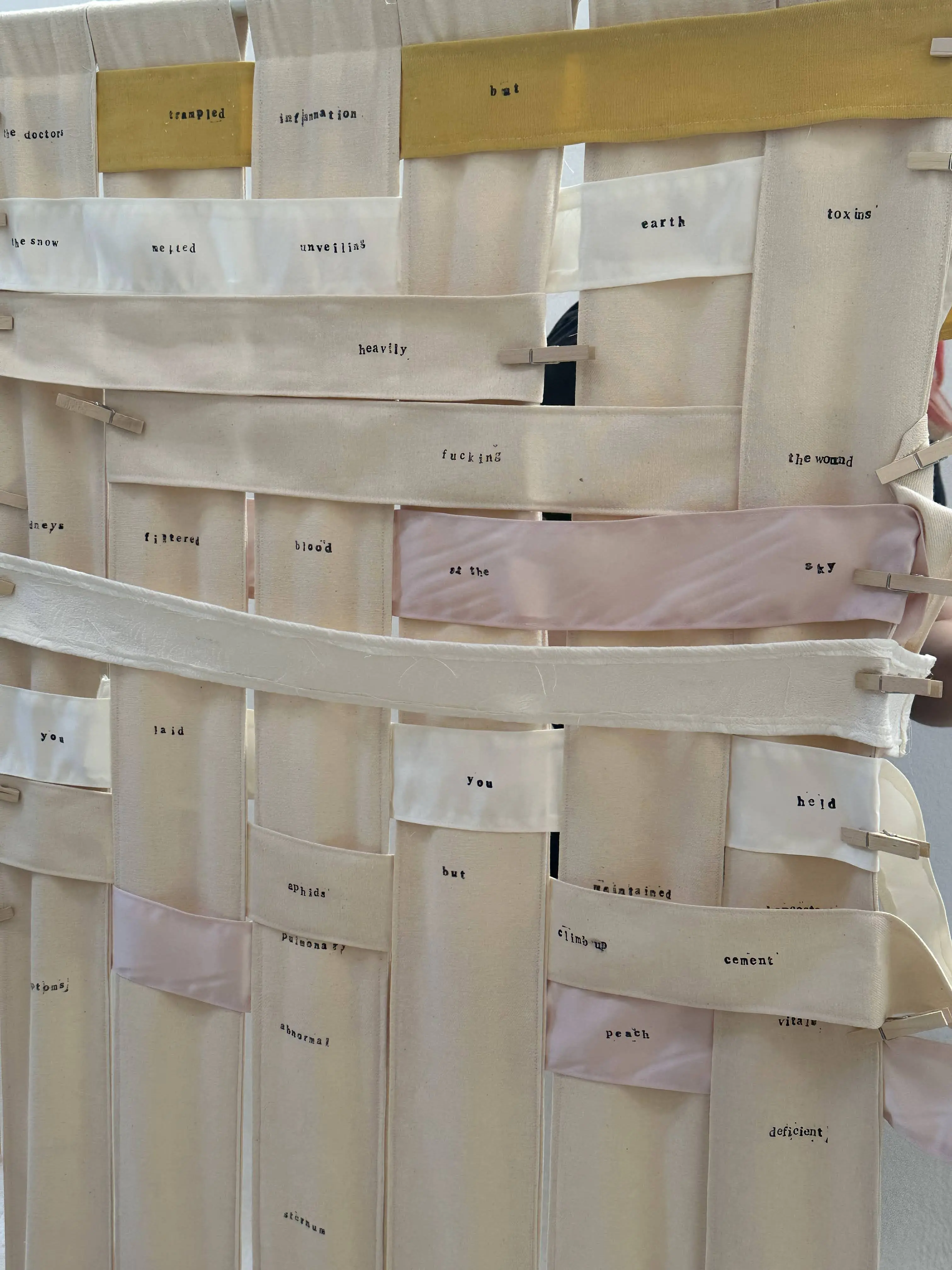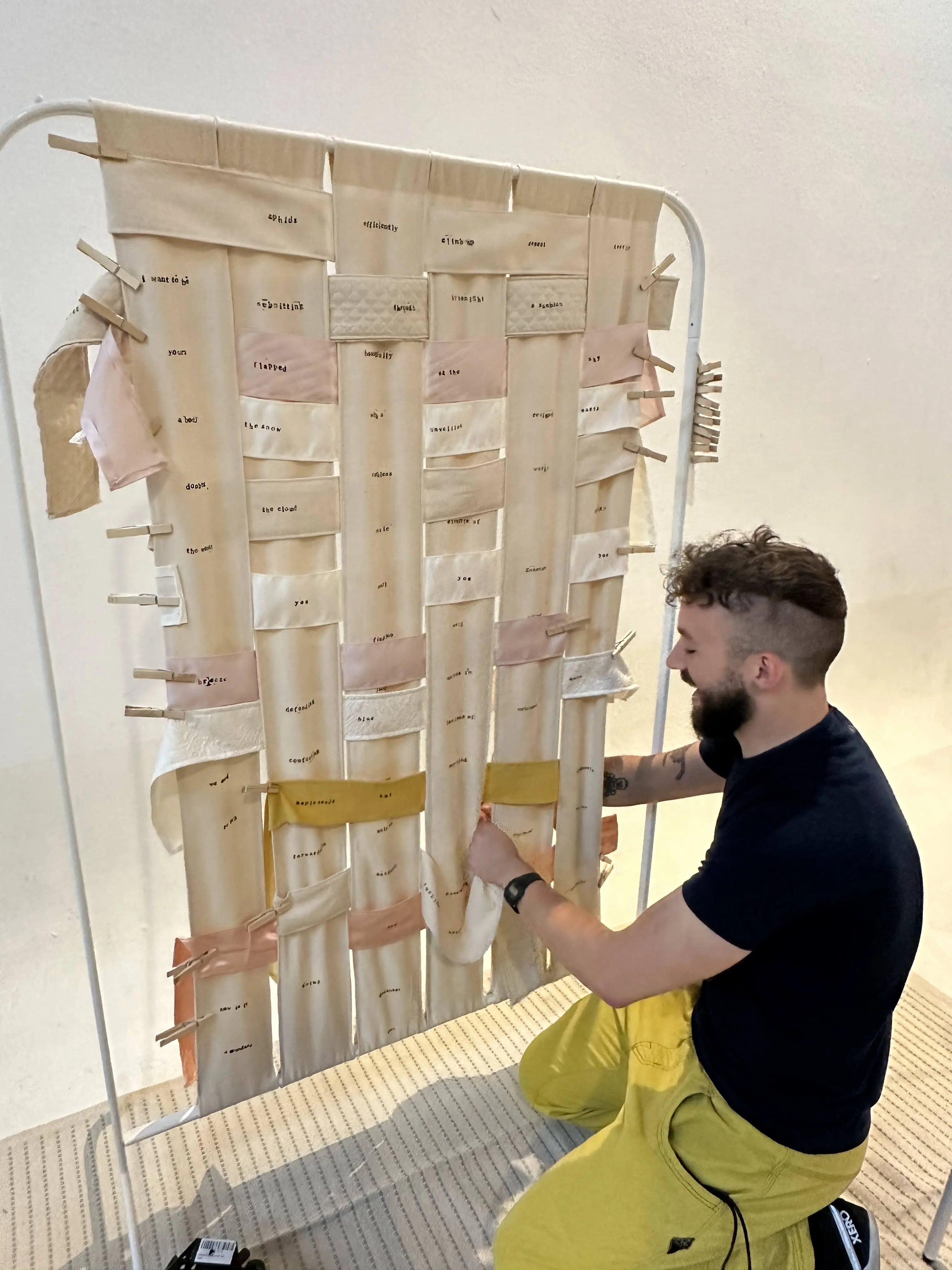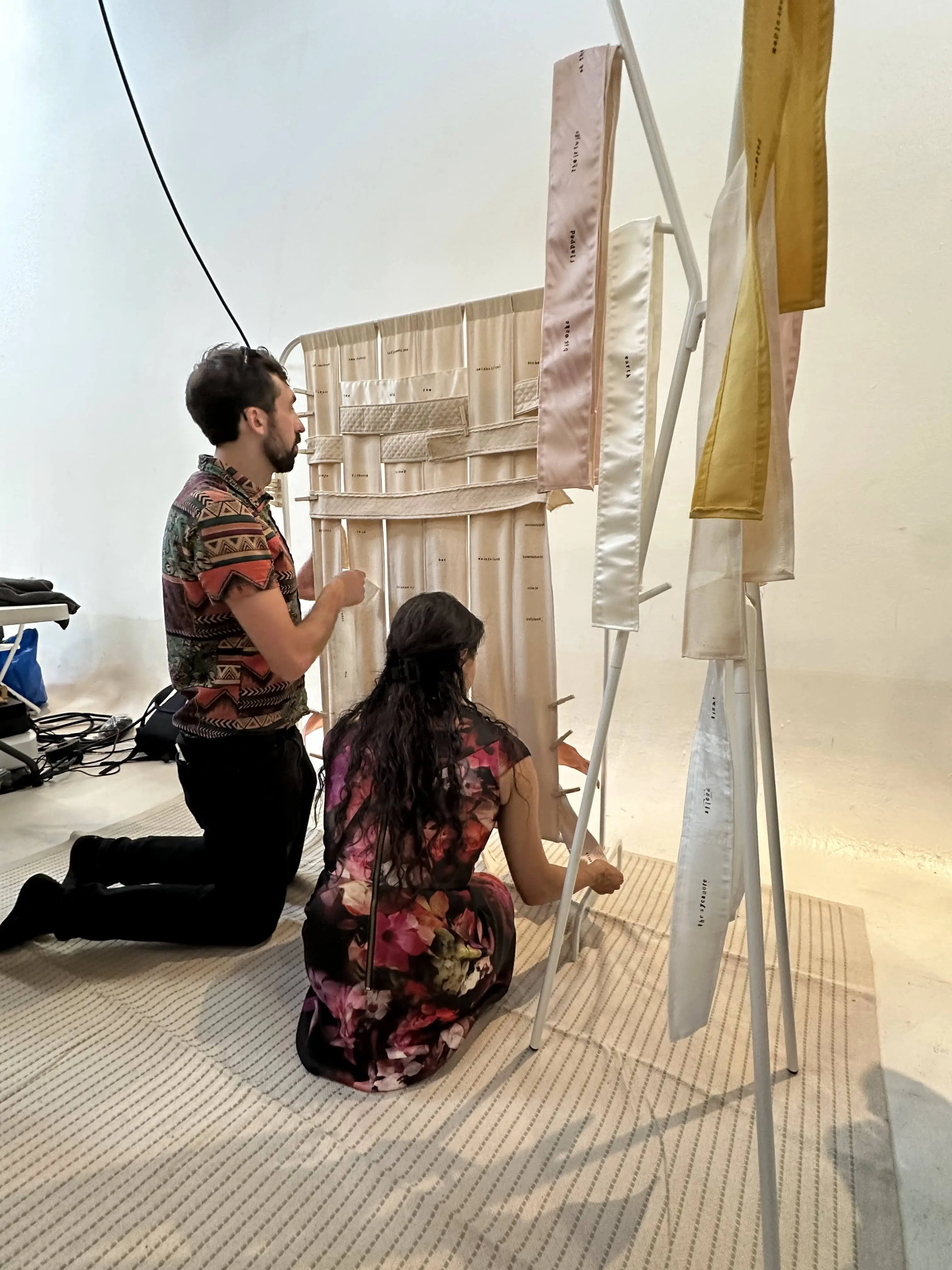 Woven Poem June 01, 2024 An interactive installation that allows participants to collectively create very constrained poetry by weaving. (1/11): (2/11): (3/11): (4/11): (5/11): (6/11): (7/11): (8/11): (9/11): (10/11): (11/11):
