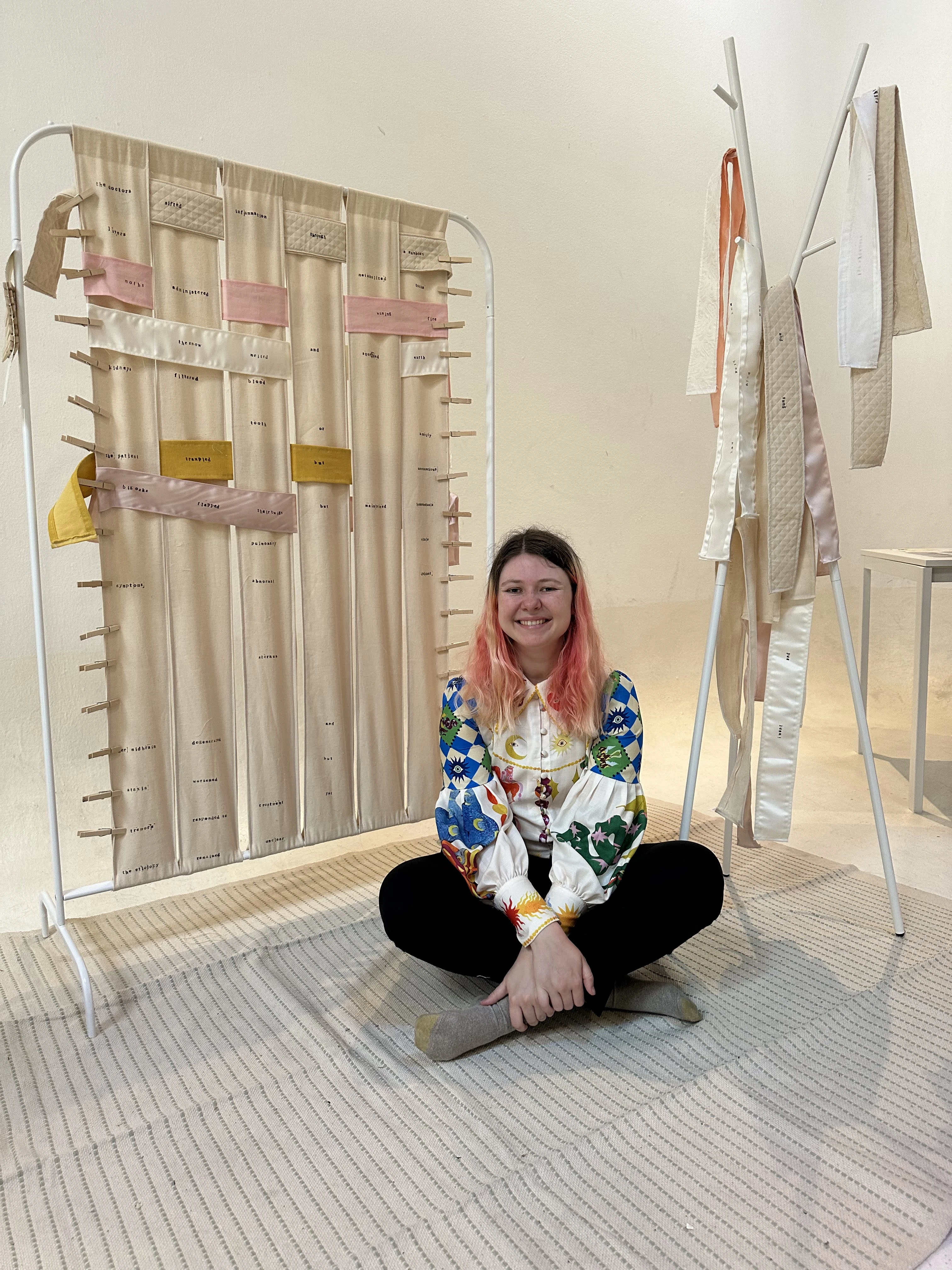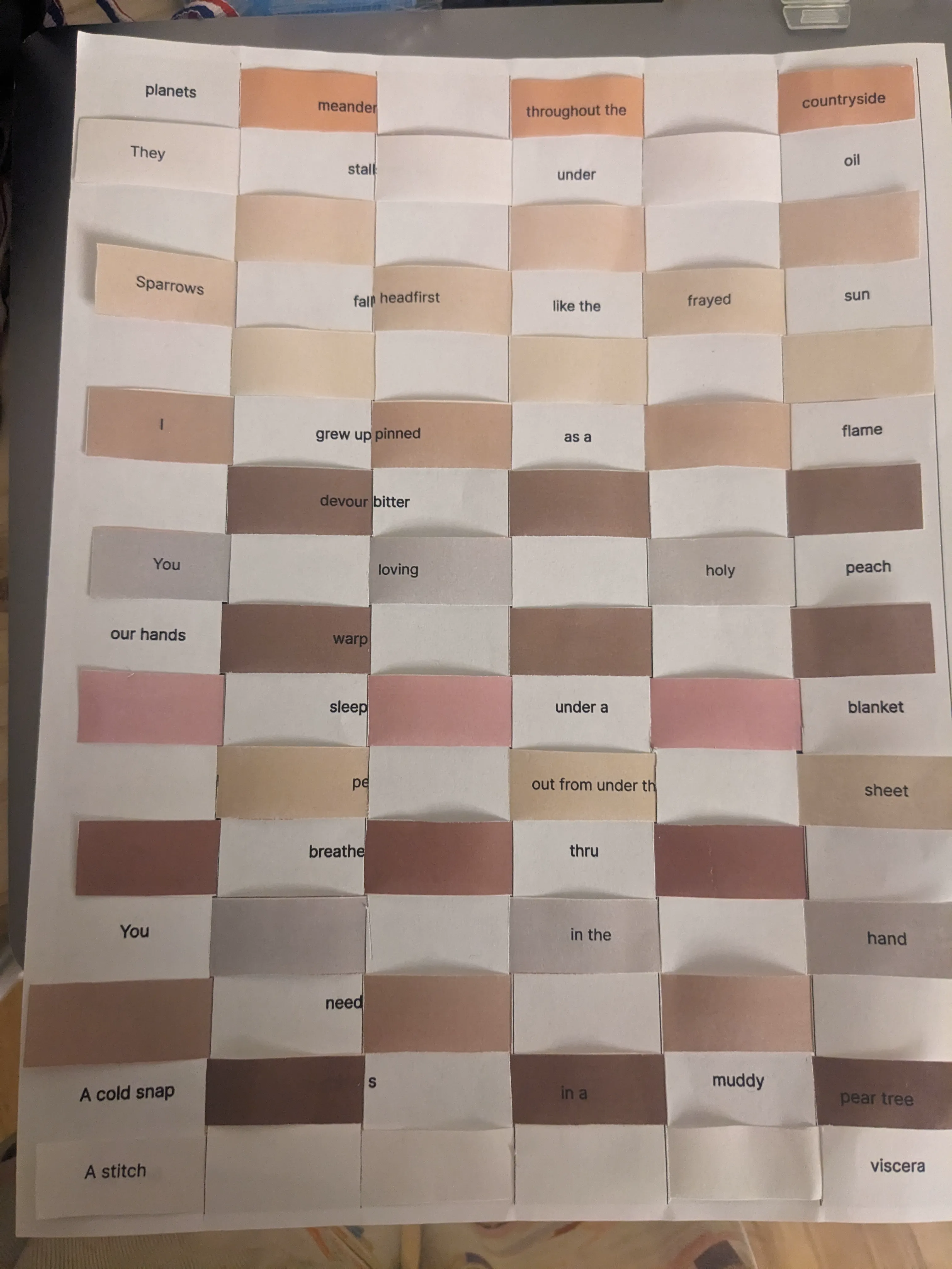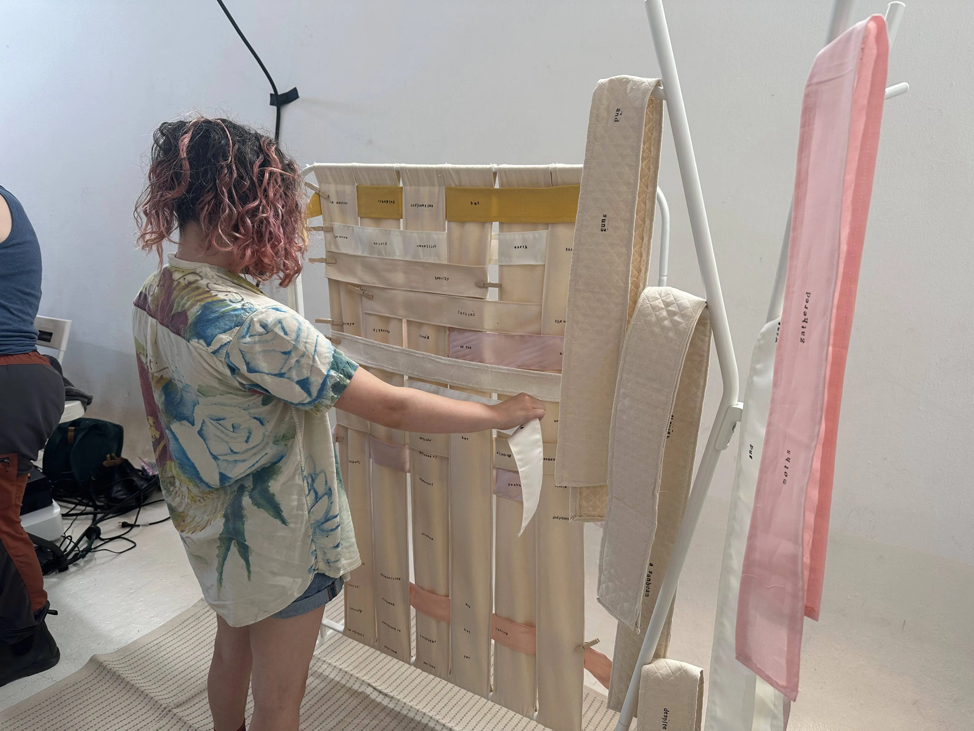 Woven Poem June 01, 2024 An interactive installation that allows participants to collectively create very constrained poetry by weaving. (1/11): (2/11): (3/11): (4/11): (5/11): (6/11): (7/11): (8/11): (9/11): (10/11): (11/11):
