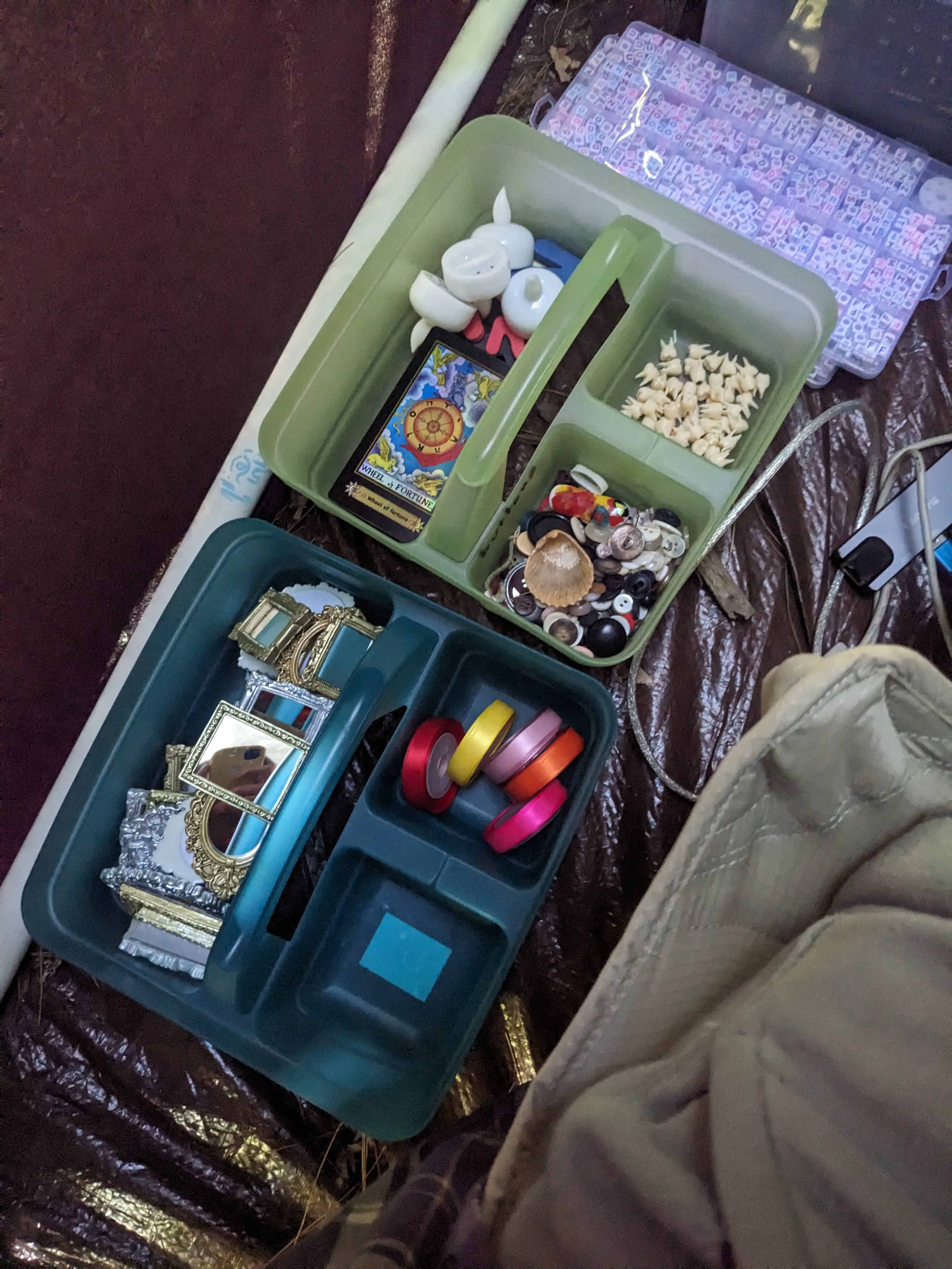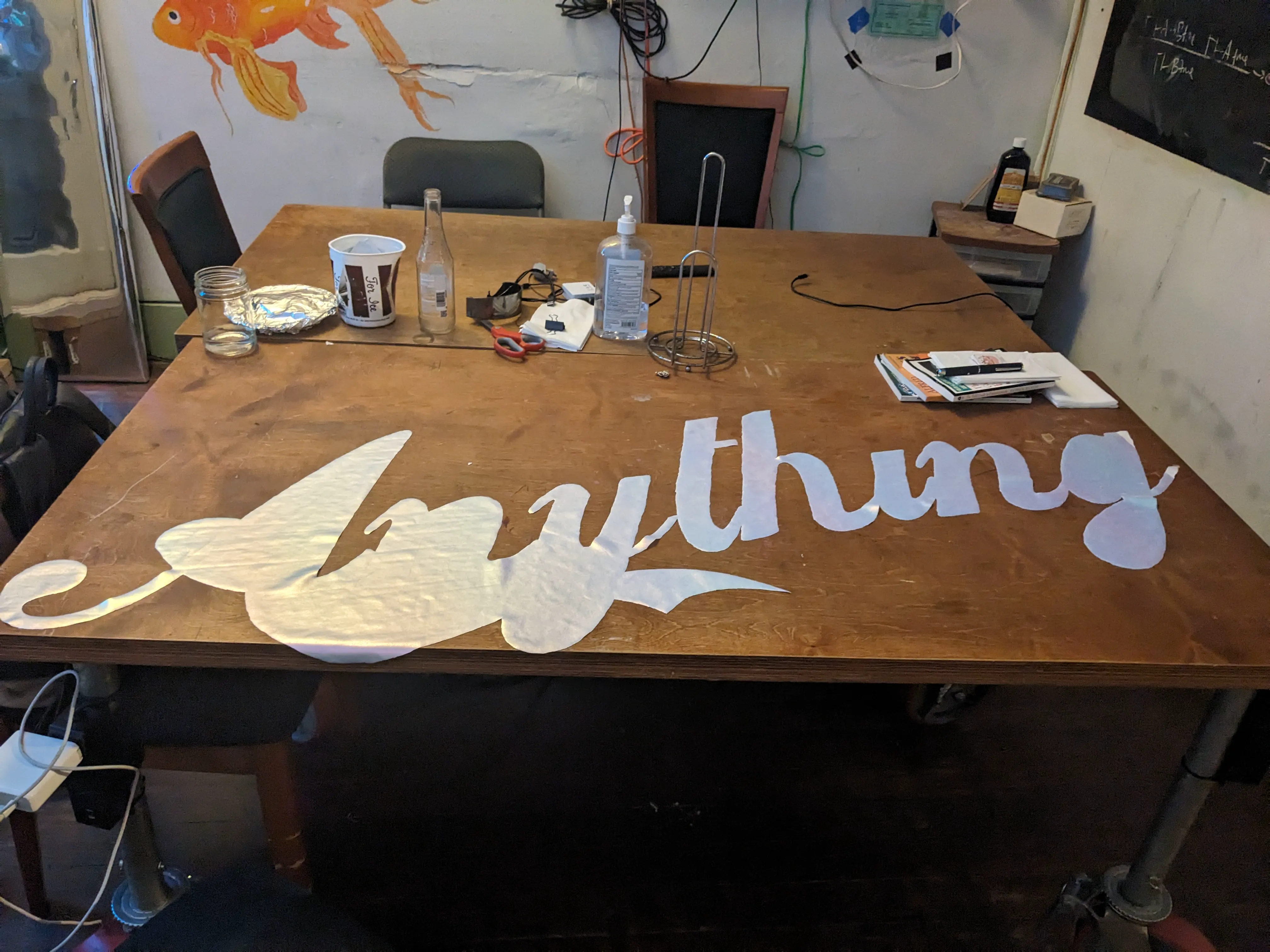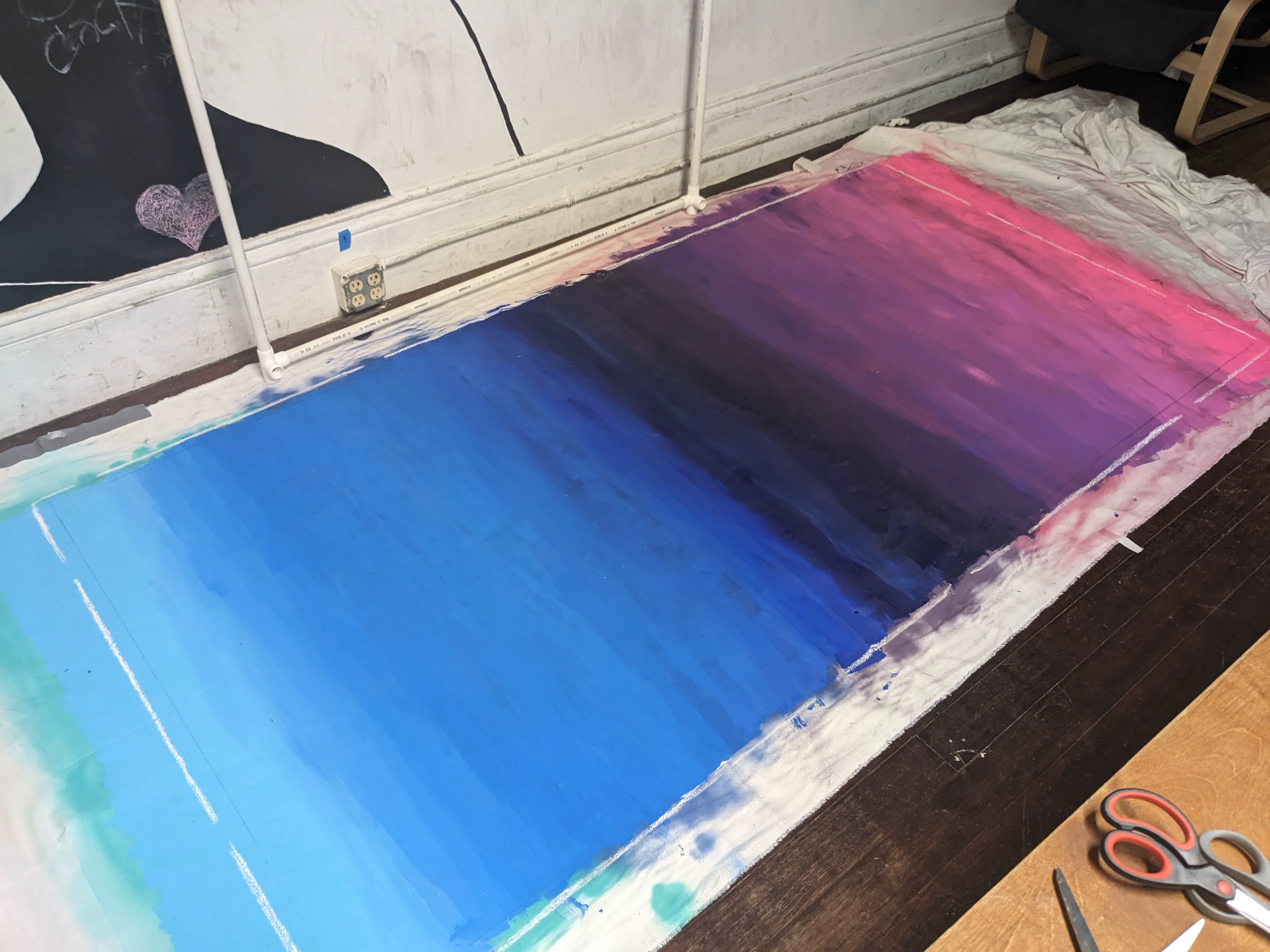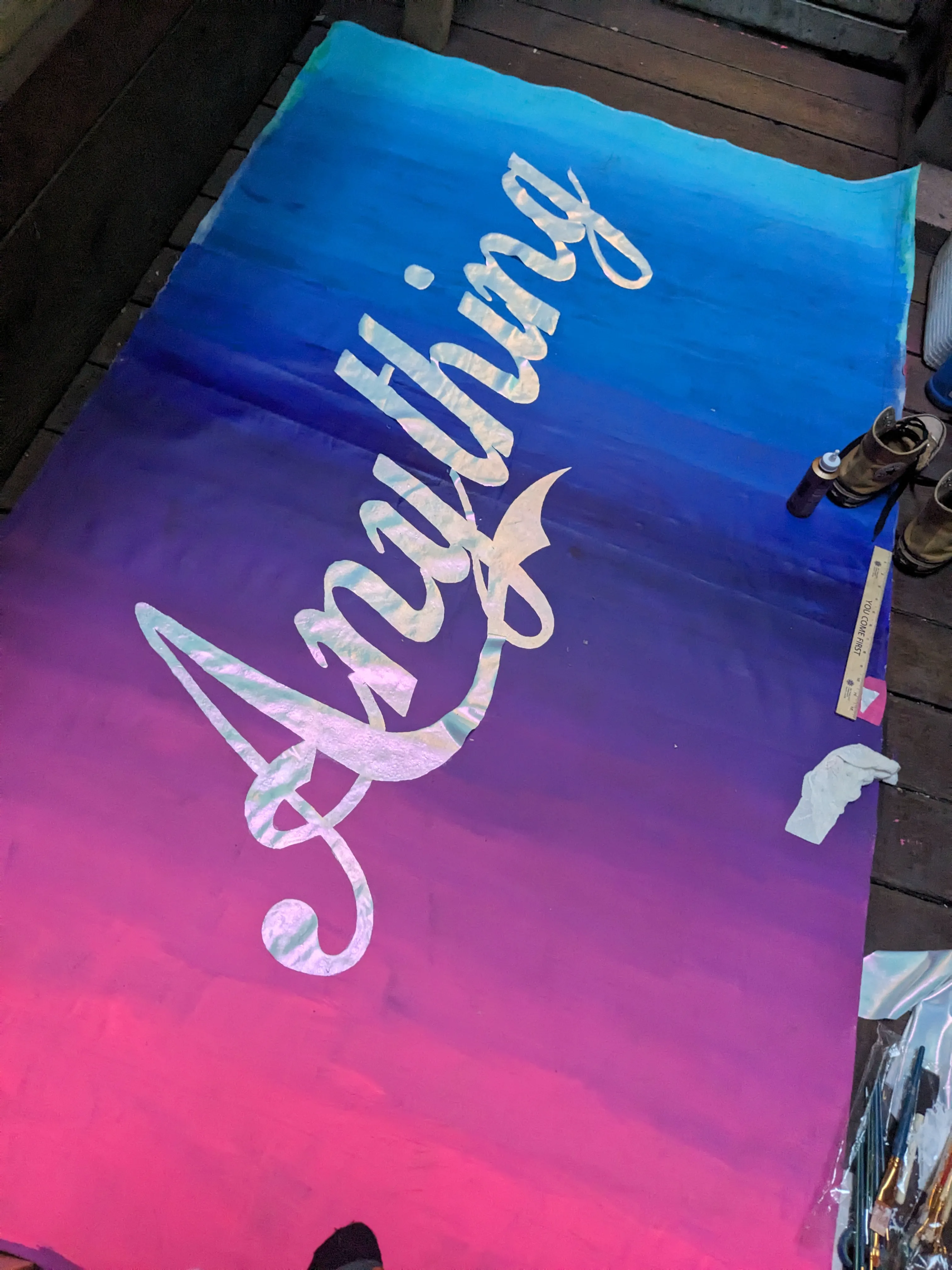 I wanted the machine to have an eye-catching and vaguely vaporwave aesthetic, but also seem recognizably like a vending machine, so I relied on the recognizability of an existing brand (please do not consider this an endorsement of coca cola). I mocked up a couple of examples and it was time to go to one of my favorite places in the world: the fabric store! I went to the sadly now-closed Fabric Outlet in the mission. I’d originally planned to sew a cover for the entire frame with a zipper, but realized when I got there that I’d need a pretty durable material to paint on and would want the rest of the vending machine to be black and as lightweight and wrinkle-proof as possible for ease of transportation, so I chose some canvas for the front, a holographic material for the lettering, and black spandex for the sides and back. I projected the letters onto the holographic fabric and cut them out, and then got to painting a gradient on the canvas with spraypaint- as you can see here, my first attempts at a gradient did not work so well, but I later cleaned it up with acrylic paint, which required less skill to blend easily.