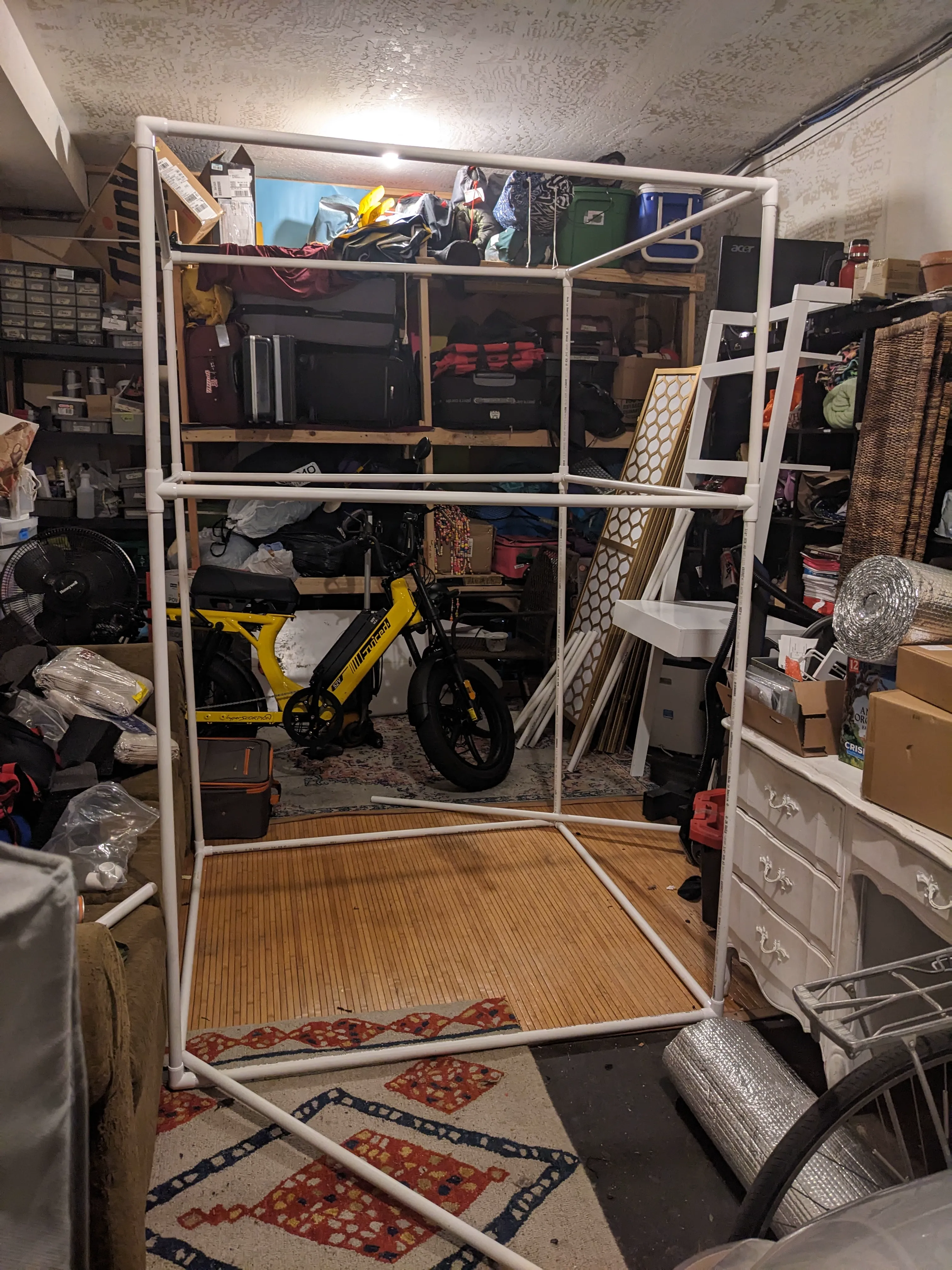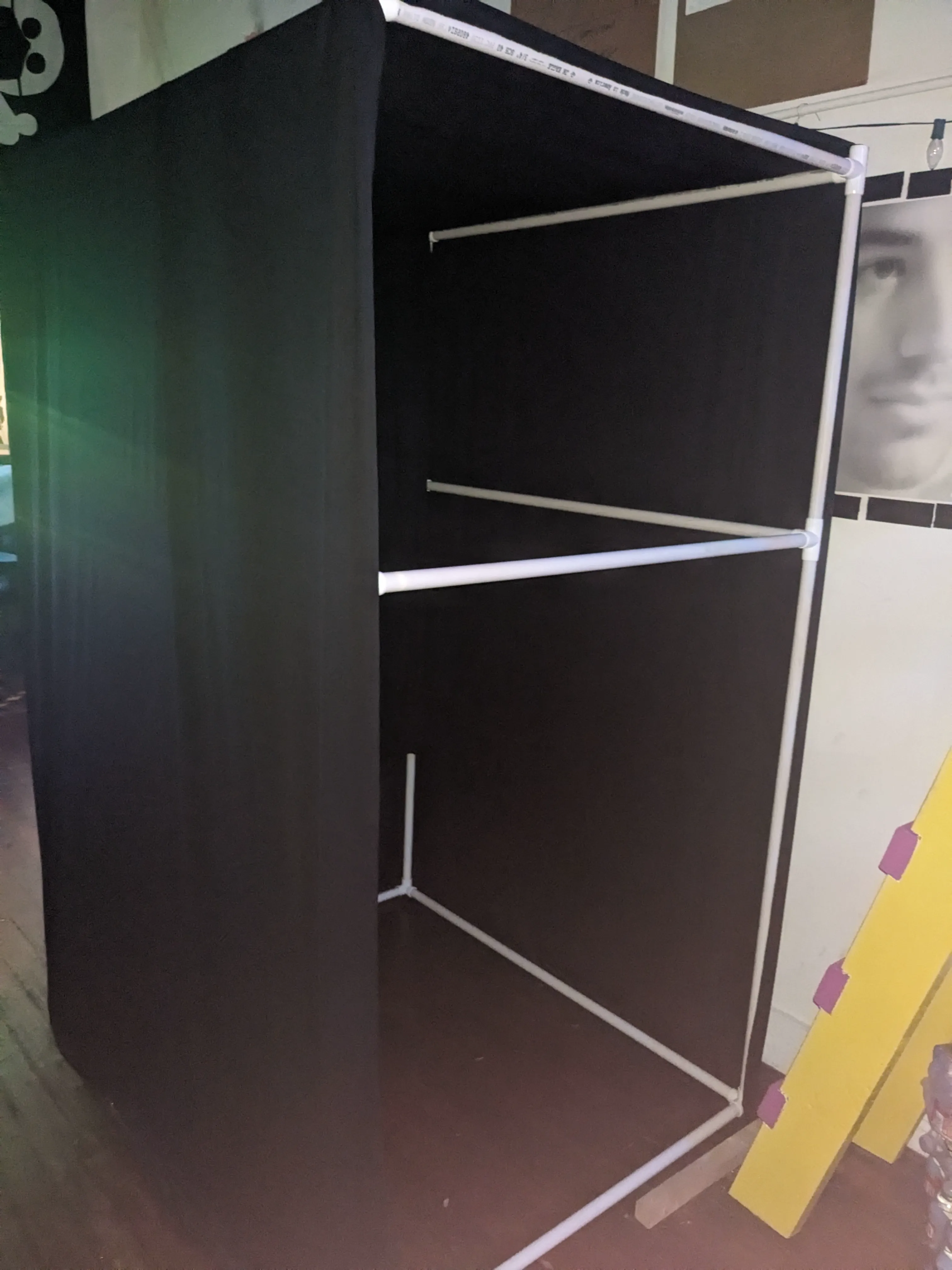 So, I decided that the frame for my vending machine should be PVC, given its durability the ease of assembly and disassembly with PVC connectors. I sketched out the rough dimensions needed to fit me inside and still have roughly the same aspect ratio as a vending machine, went to Home Depot, purchased the PVC and connectors, and cut the PVC down to size.