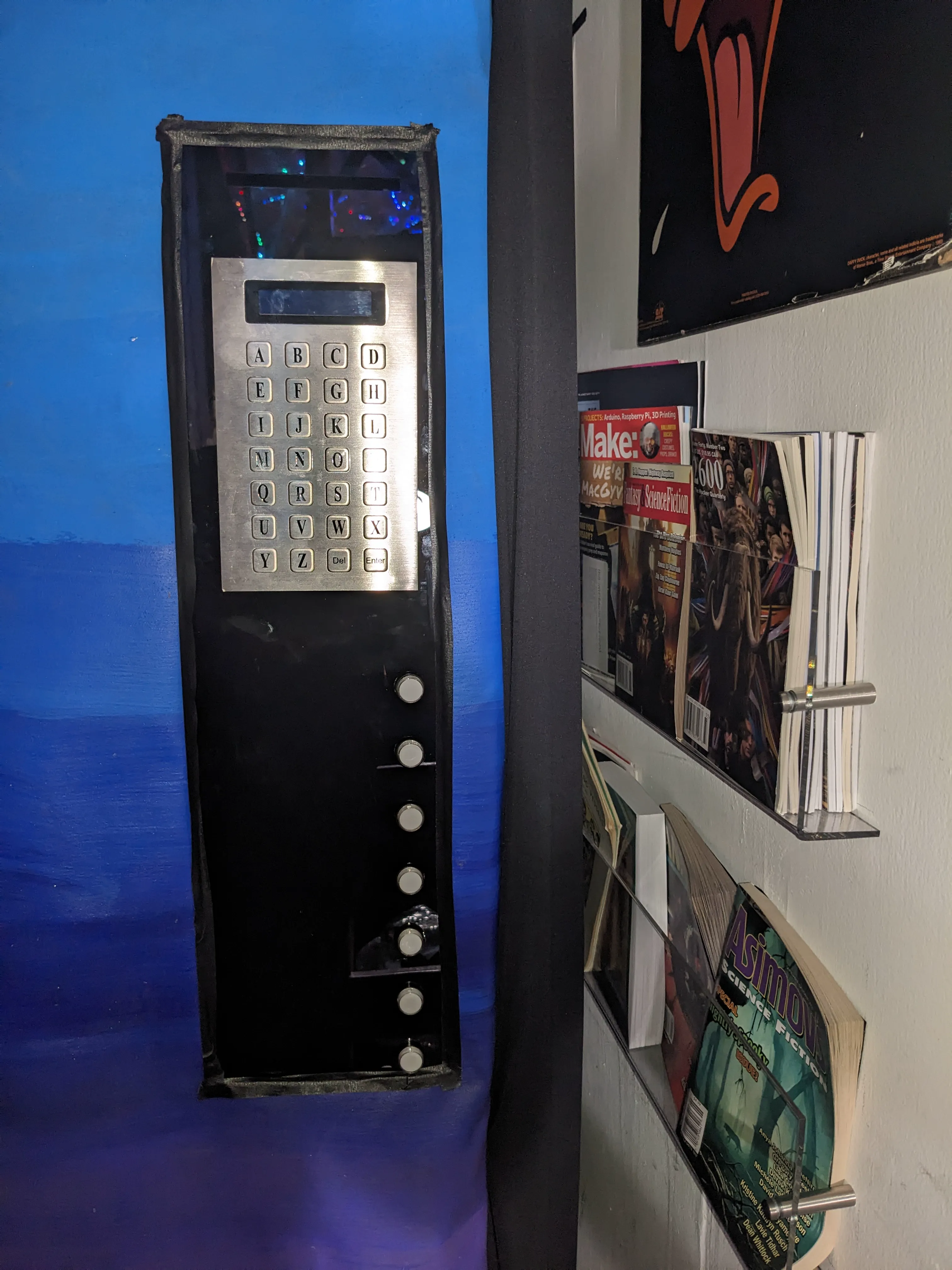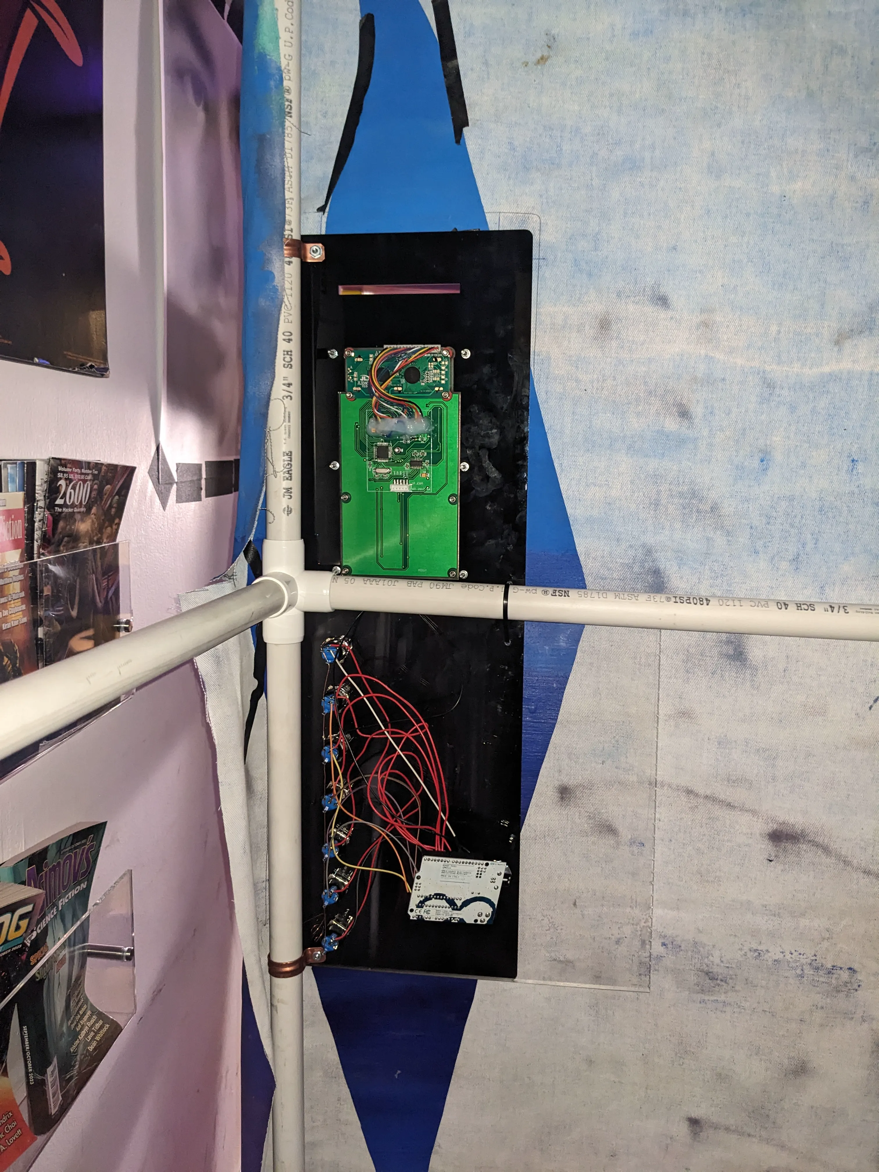 Some goals I had in my recreation of the vending machine were to make it Accessible and engaging for people not familiar with the SCP Reusable (the original cardboard frame basically fell apart completely at the end of a single use) Transportable on public transportation by 1 or 2 people (the SCP machine had to be hauled on a dolly and stabilized by several people, even when only transported a quarter mile) Compact and easy to assemble and disassemble (I lived in a shared triple room at in a co-op at the time, and the garage only had a small slot of available for the storage of my belongings)